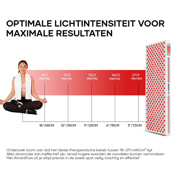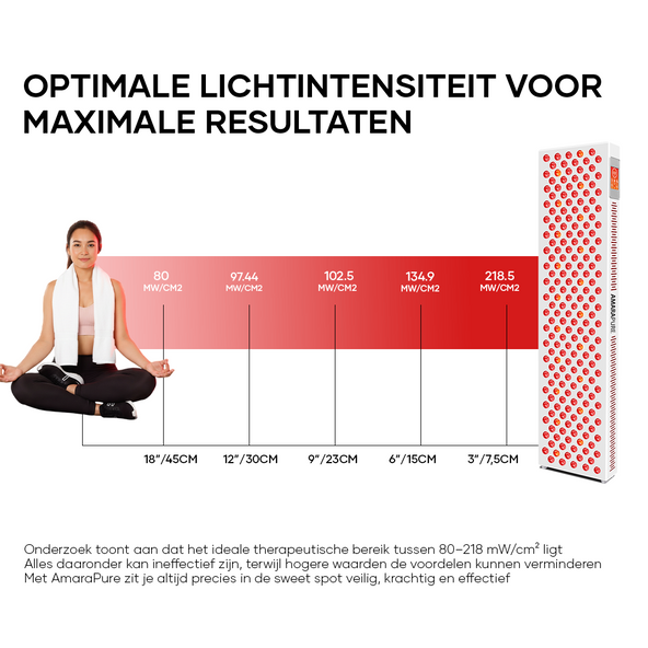 - Afstand & duur: 5–10 minuten per zone als start; bouw op naar 10–20 minuten per gebied. Houd 15–45 cm afstand volgens de handleiding. Start met 3–5 sessies per week.