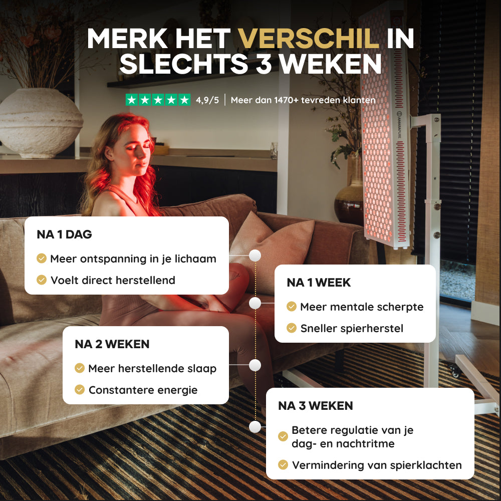 • Meer energie & betere nachtrust bij regelmatige sessies — korte dagelijkse behandelingen kunnen al verschil maken.