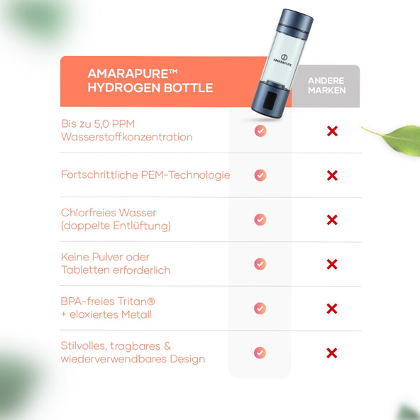 AmaraPure™ reichert Ihr Wasser mit bis zu neunmal mehr therapeutischem Wasserstoff über die Wasserstoffflasche an, wodurch normale Flüssigkeitszufuhr zu einem wirksamen Verbündeten gegen oxidativen Stress und Schäden durch freie Radikale wird. Nur 1 bis 3 Flaschen pro Tag können Ihrem Körper einen Schub geben, sodass Sie energiegeladen, optimal hydriert und zu allem bereit sind.