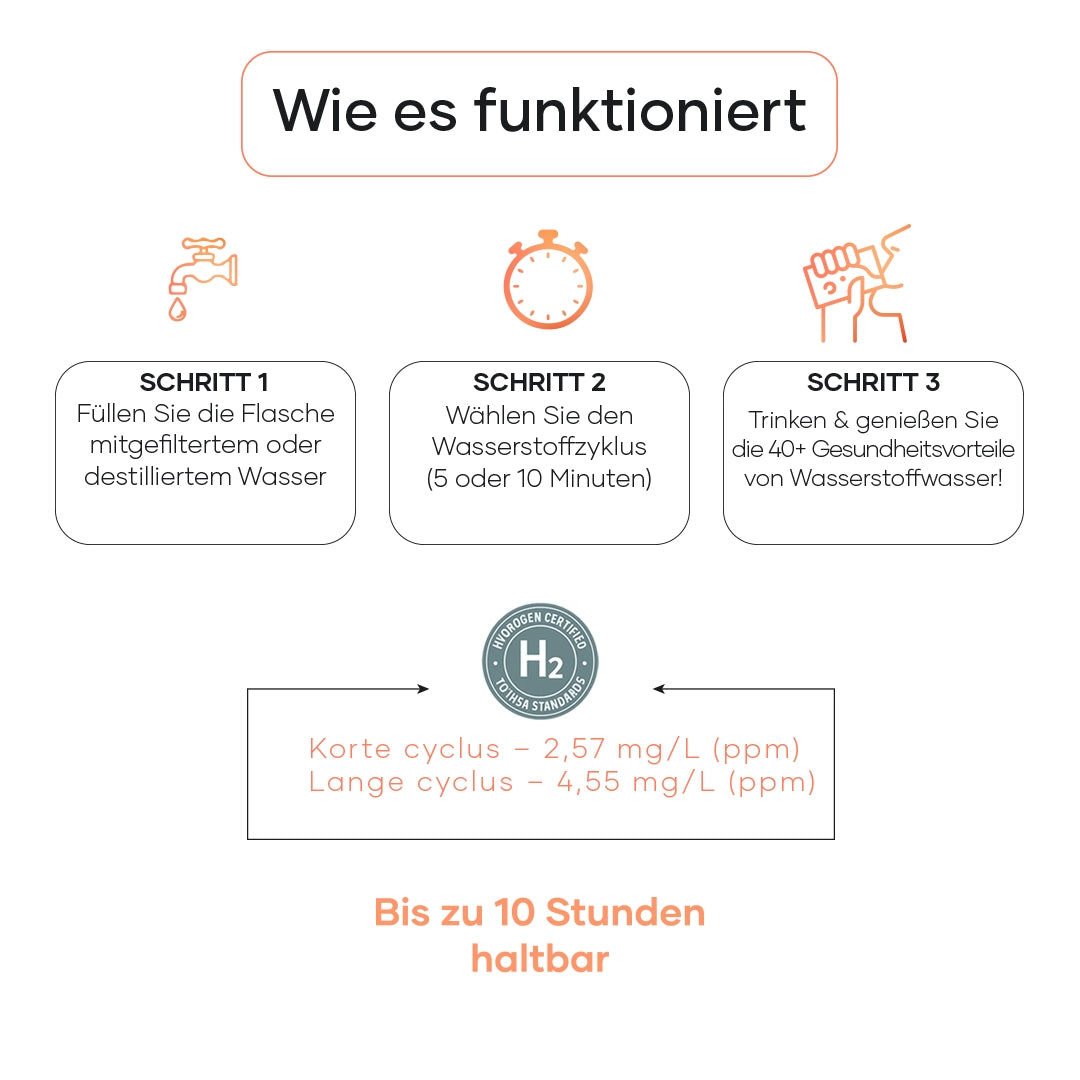 - Schnelle Produktion – Wasserstoffreiches Wasser innerhalb weniger Minuten fertig.