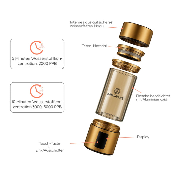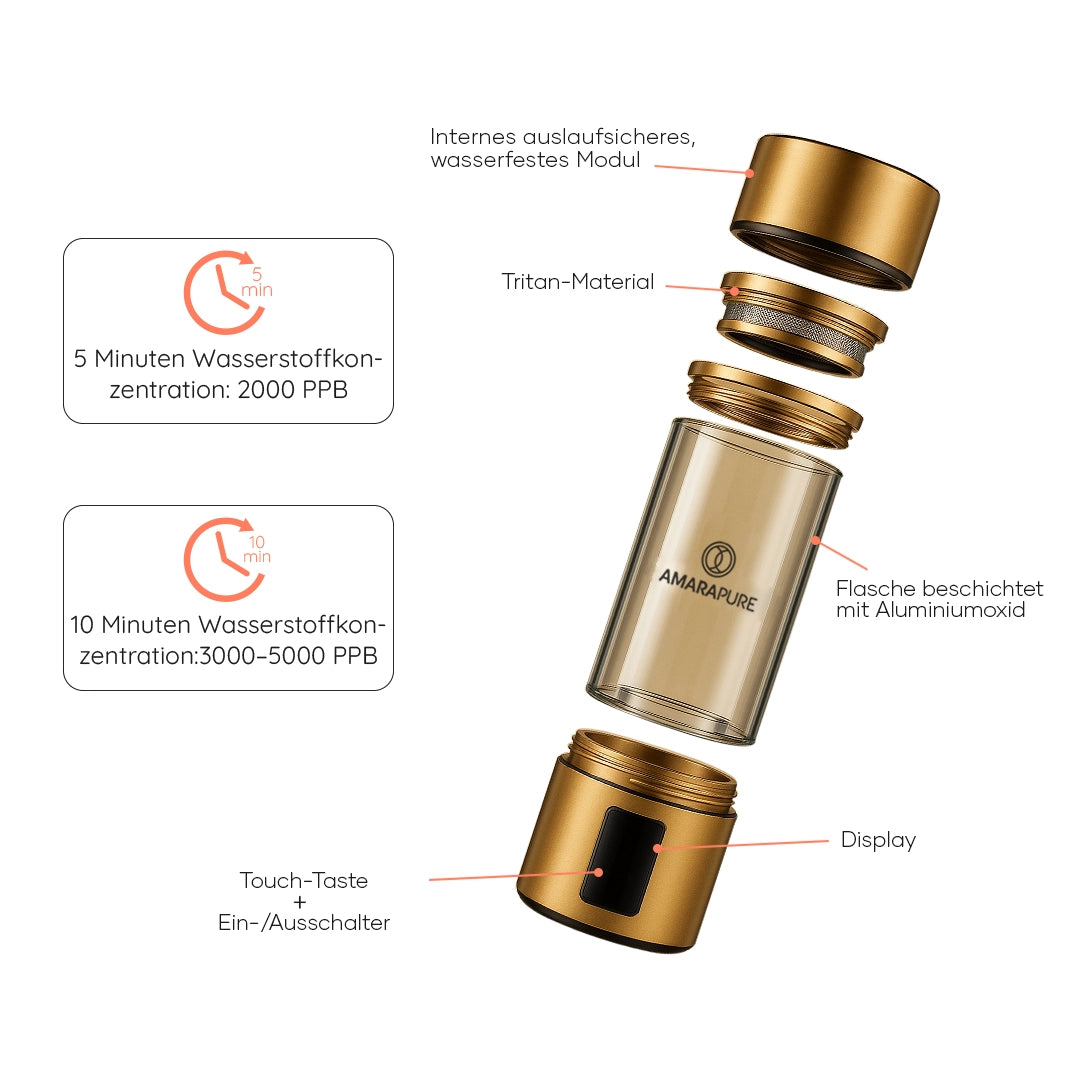 Entfesseln Sie die Kraft des Wassers. Der AmaraPure™ Aman reichert Ihr Trinkwasser in nur 3 Minuten mit molekularem Wasserstoff an – für mehr Energie, schnellere Regeneration und tiefgehende Zellpflege. Kompakt, stilvoll und immer griffbereit.