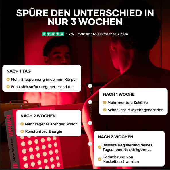 • Mehr Energie & besserer Schlaf Bei regelmäßigen Sitzungen können bereits kurze tägliche Behandlungen einen Unterschied machen.