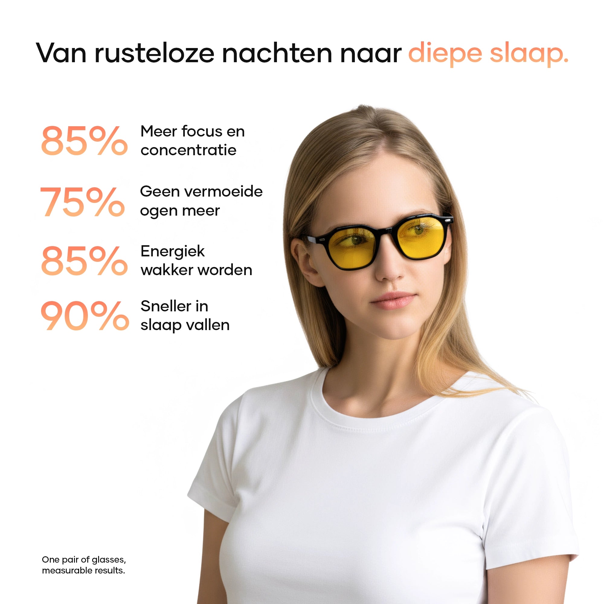 Onze blauwlichtbrillen bieden wetenschappelijk onderbouwde bescherming voor je ogen en slaap. Ideaal voor iedereen die veel tijd doorbrengt achter schermen, overdag én ‘s avonds.