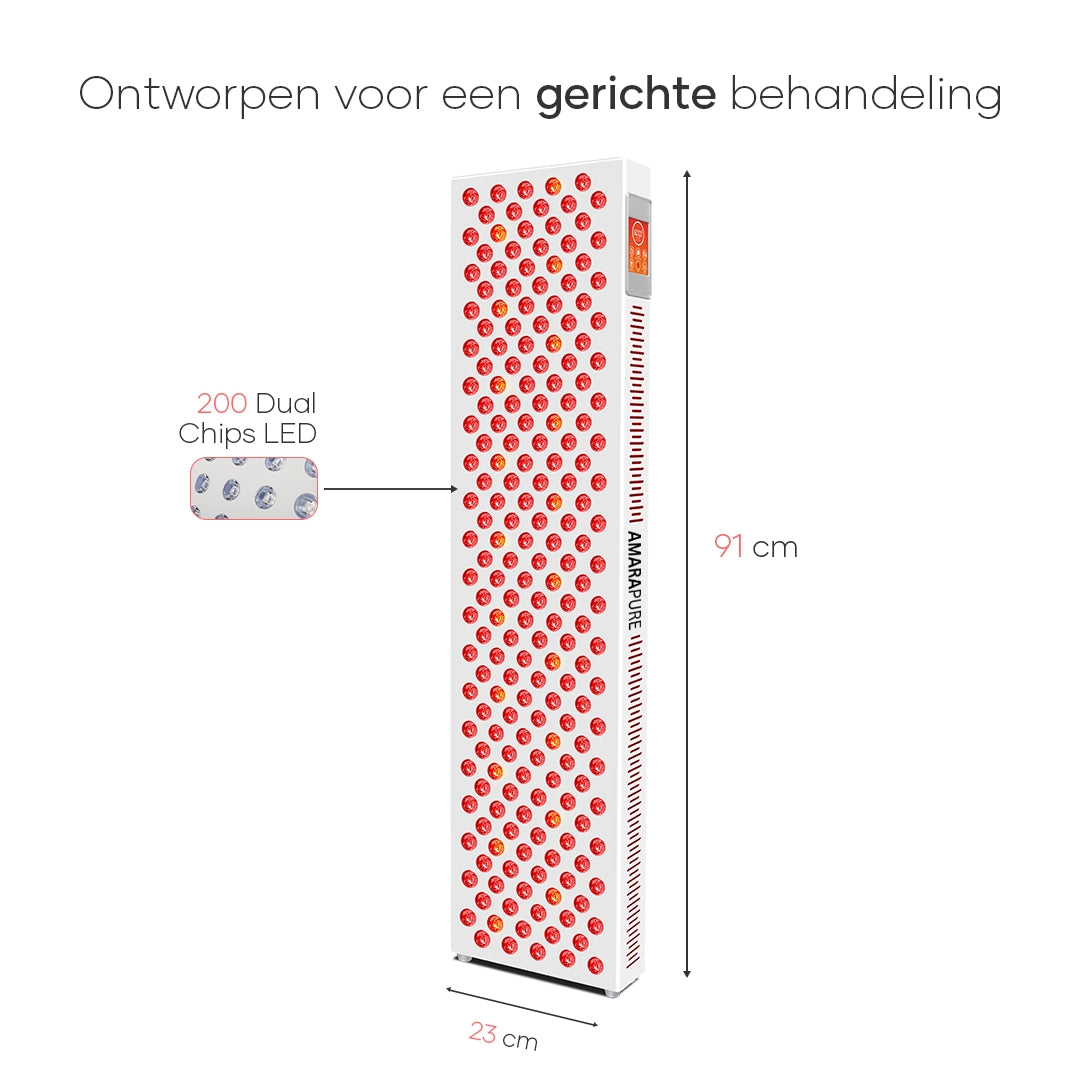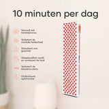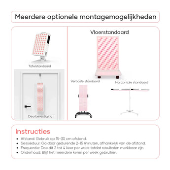 • Afstand & duur: 5–10 minuten per zone als start; bouw op naar 10–20 minuten per gebied. Houd 15–45 cm afstand volgens de handleiding. Start met 3–5 sessies per week.