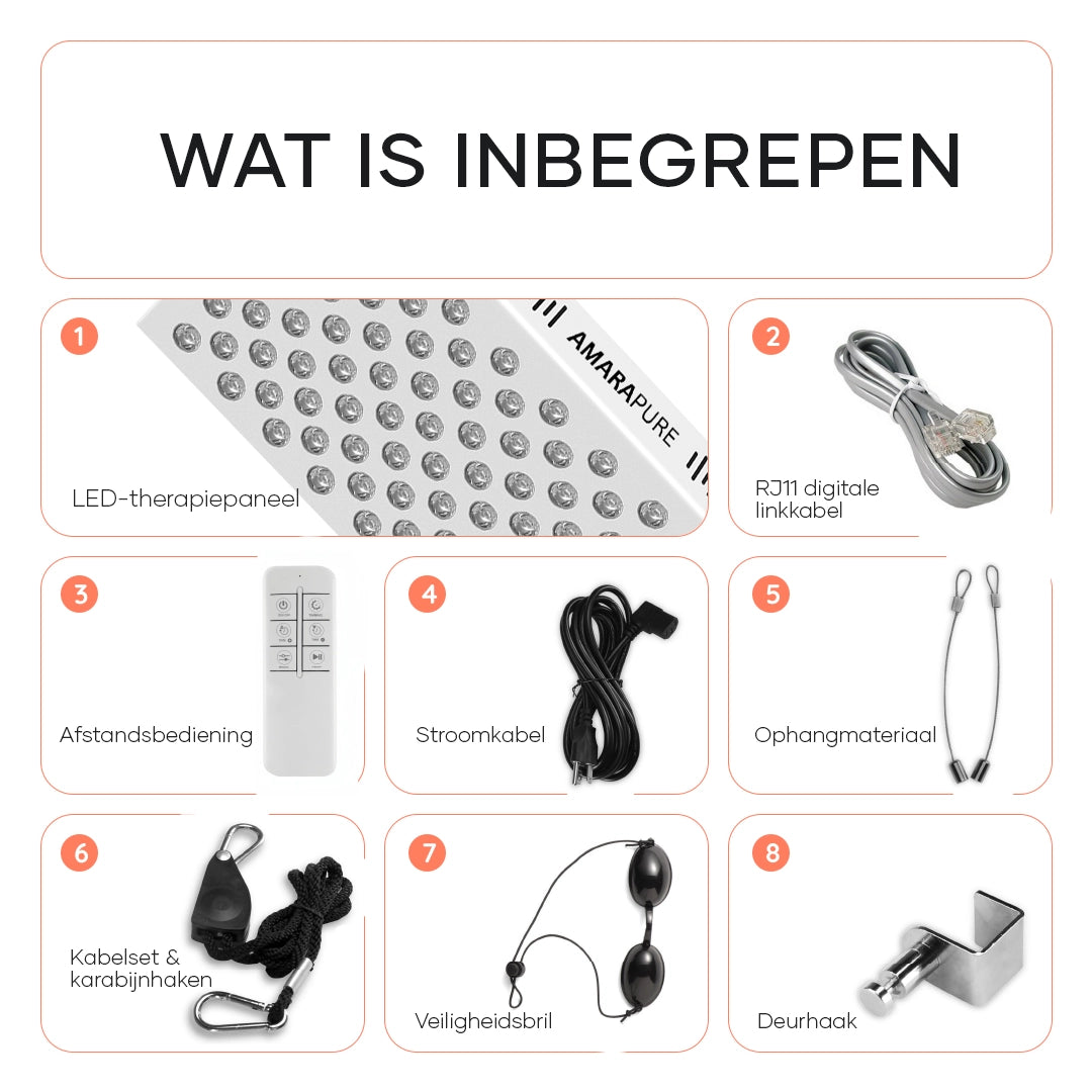 Overzicht van alle onderdelen die bij het LED-therapiepaneel geleverd worden.